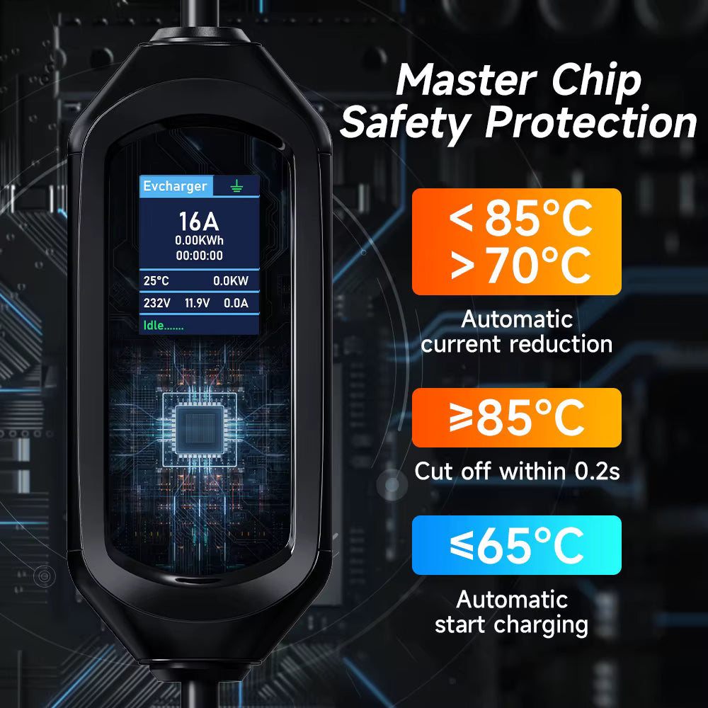 WiFi Smart APP-Steuerung: Integrierte Smart APP, die es Ihren Fahrzeugen ermöglicht, während der Ladezeit außerhalb des Spitzenzeitraums aufzuladen, und Geld bei den Stromrechnungen zu sparen. Und es ermöglicht die Anpassung des Ladestrombereichs von 6 A bis 16 A, eine vollständige Benachrichtigung oder die Verfolgung des Ladestatus.